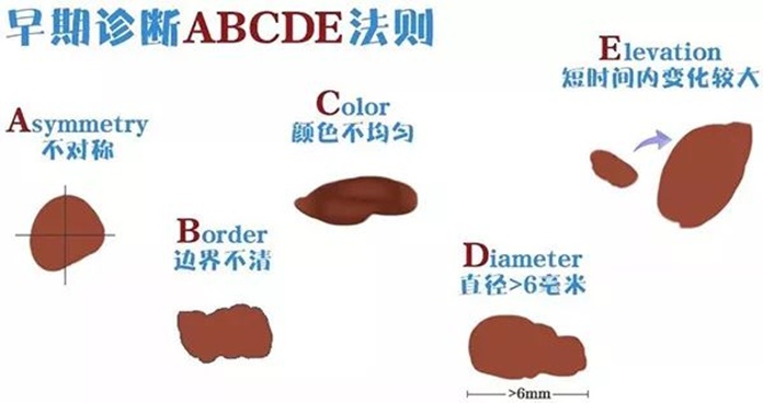 参考“早期诊断ABCDE法则”是促使色素瘤早期发现非常有效的自检方式之一。