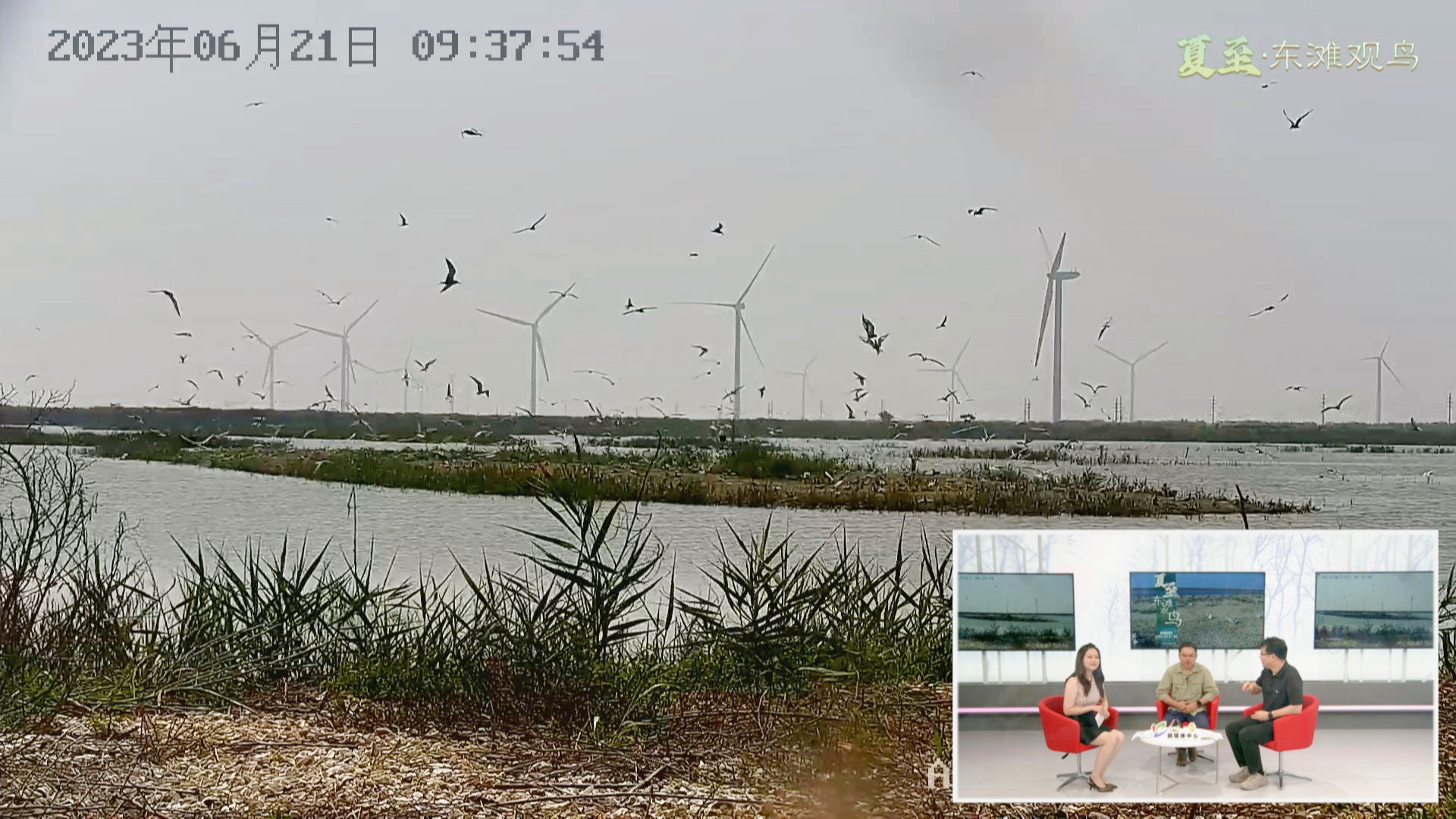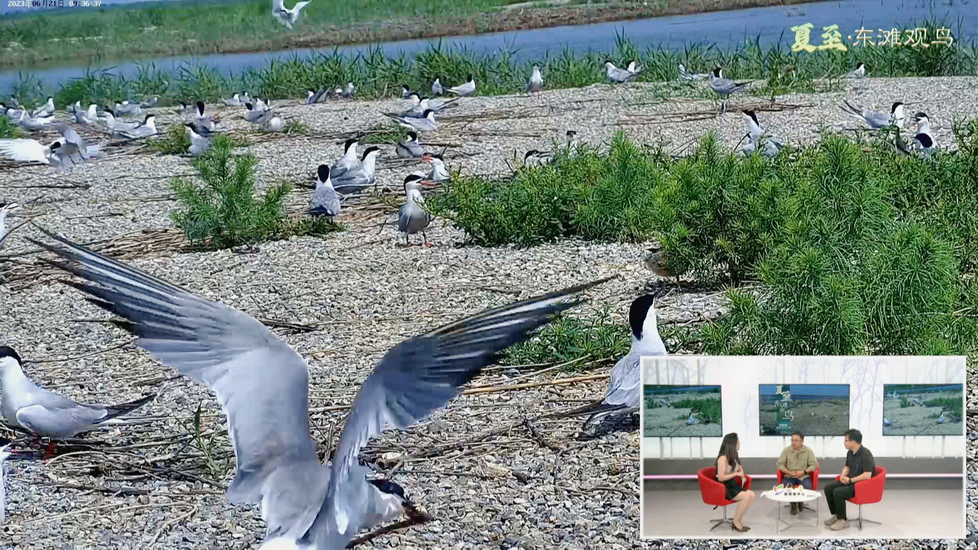 每年夏季,都有不少候鸟在东滩繁衍生息。崇明东滩自然保护区核心区的燕鸥岛上,数百对“燕鸥夫妇”正悉心照顾刚刚破壳而出的燕鸥宝宝。开阔的水面上,黑翅长脚鹬和反嘴鹬悠闲觅食,茂密的芦苇荡和丰富的鸟类生物形成了这里独有的景观。在演播室的主持人和嘉宾向广大网友介绍了燕鸥、黑嘴鸥等常见的夏候鸟在崇明的繁殖及栖息情况。