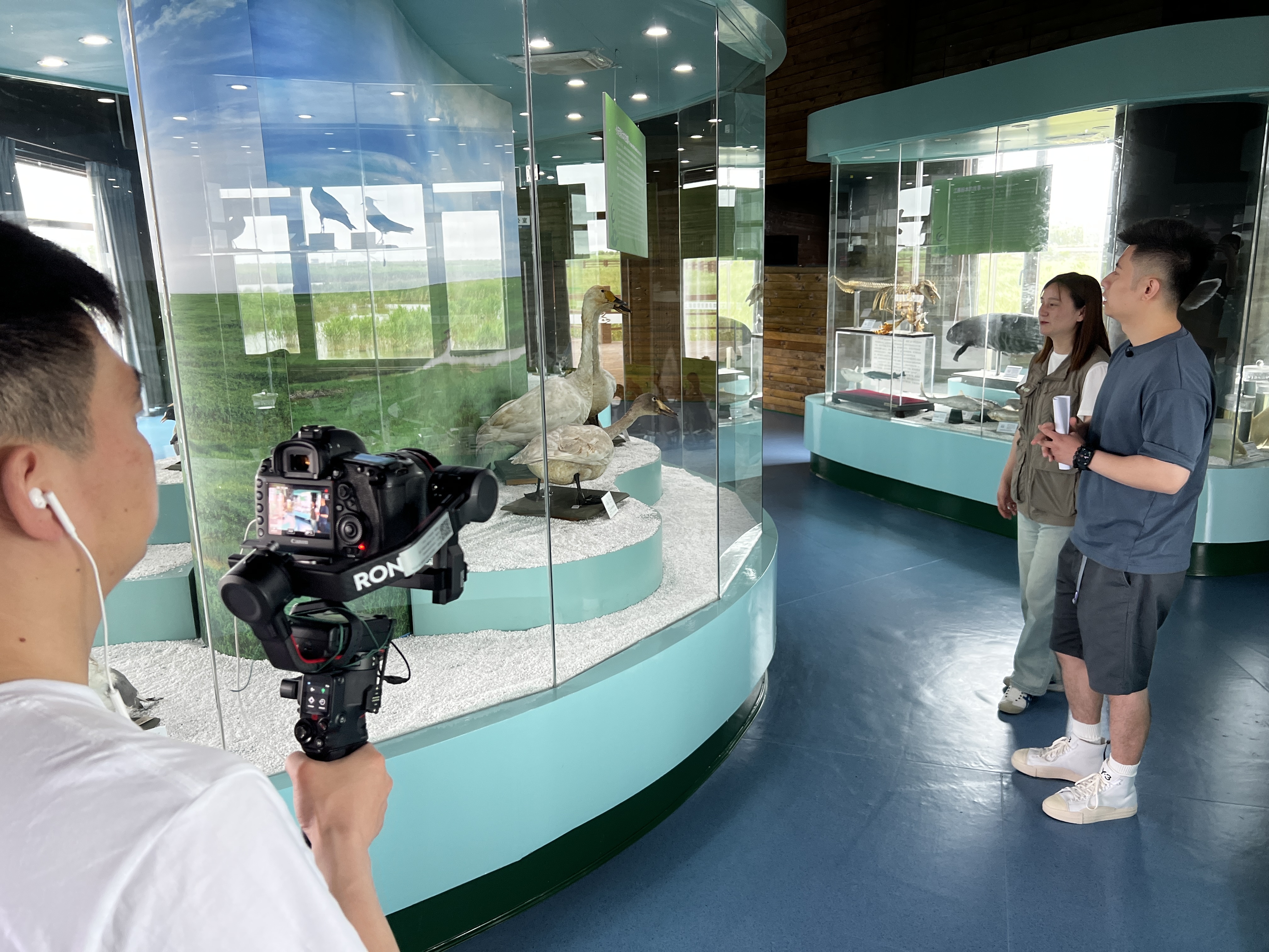 直播中,主持人还与身在科普教育基地标本馆的记者进行连线,向大家介绍了震旦鸦雀、小天鹅、绿头鸭、琵鹭、白头鹤等常见的东滩鸟类标本。保护区工作人员与观众们分享了鸟儿的饮食习惯、喜好环境以及保护区治理外来入侵物种互花米草等有趣的知识,让大家对崇明东滩丰富的鸟类物种和环境保护工作有了更深入的认识和了解。
