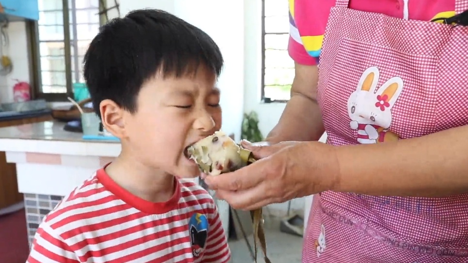 姆妈专心致志裹粽子,小囡不时过来看看,或是干脆守候在侧不离左右。旧时岛上多贫困户,一向少有零食入口,而今端午有粽子吃,里边还包着枣子等好货,内心的喜悦与期待不言而喻。