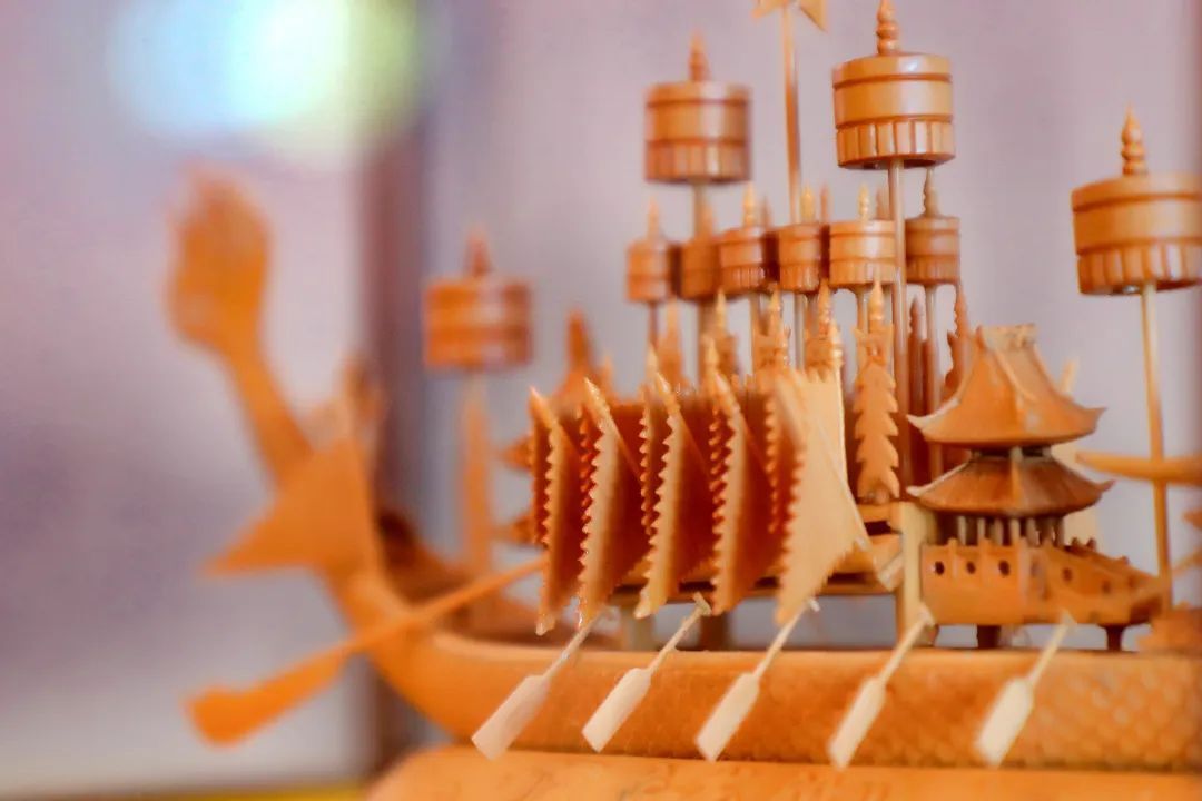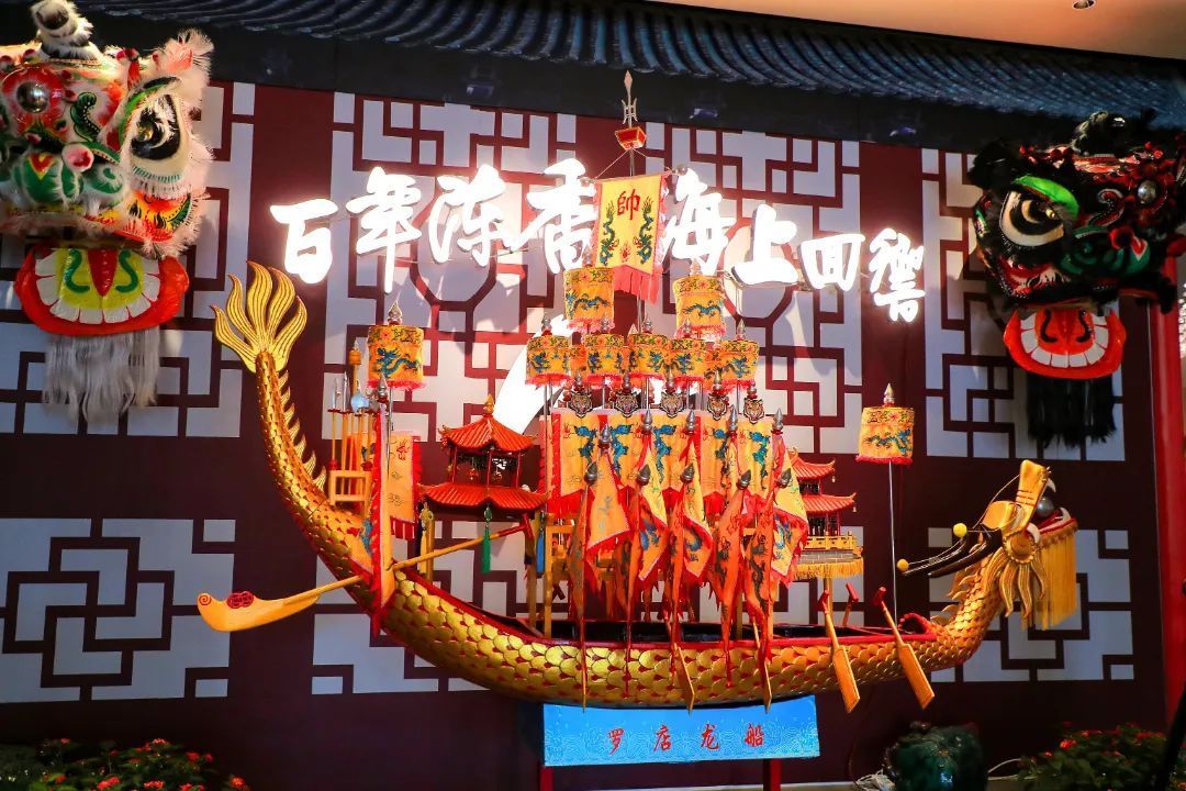 罗店龙船,拥有400多年的历史,具有独树一帜的鲜明特色。鳄鱼嘴、麒麟角,颌下长须拂水,全身叠鳞映彩。船上建有当地明代北极阁模型,双层飞檐、雕梁画栋,两侧插满锦旗,小巧玲珑,集中了造船、建筑、雕刻、扎灯、织锦、刺绣、书画等众多造型艺术的精华,体现出龙船艺人的匠心。