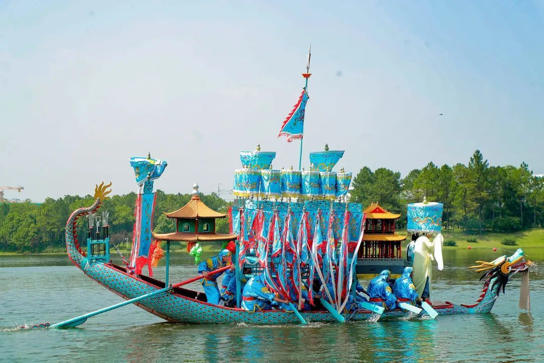 湖面如镜,龙船由“点睛”之礼被赋予“生命”。在立杆、旺盆、送标、接龙、砍缆、启航等传统仪式之后,3艘旗仗鲜明、锦彩夺目的罗店龙船缓缓驶向湖心,开启激动人心的水上表演。
