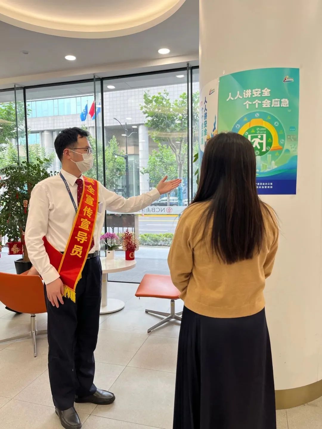 南商中国上海分行积极深入开展安全宣传进企业、进农村、进社区、进学校、进家庭等全覆盖活动。一是在网点办公区域醒目位置通过电子显示屏、三连屏等形式,滚动播放安全生产月主题内容、宣传海报和公益视频;二是结合微信、企业微信等渠道转发宣传官方安全生产科普知识,通过内部培训、参与线上“逃生演练训练营”等方式积极灵活做好“阵地”宣传工作;三是充分以客户前来办理各类业务为契机,做好线上与线下相结合,着重做好单位与家庭可能存在的火灾消防安全隐患,向客户系统地讲解消防灭火器材的正确使用方法、火灾现场的疏散和逃生技巧。四是通过组织开展“安全宣传咨询日”现场活动,向企业客户、网点所在的大楼社区发放宣传资料,由宣传专员针对大家关心的安全生产问题现场解惑答疑。