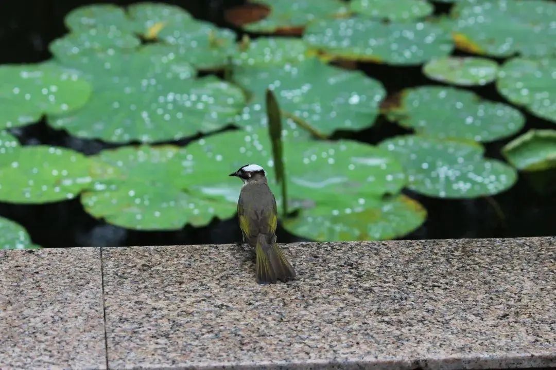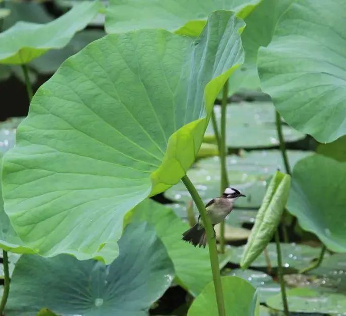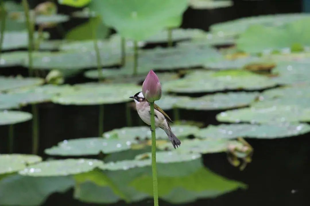 随着公园绿色病虫害防控措施的逐步推进应用,喷洒农药的次数逐年递减,园内鸟类的数量和种类也有明显的增加。白头翁便成了荷花池的常客,小小的一只鸟儿或藏于荷叶之间,或大明大方地站立于池边,同市民游客一同欣赏这片美丽荷花池。