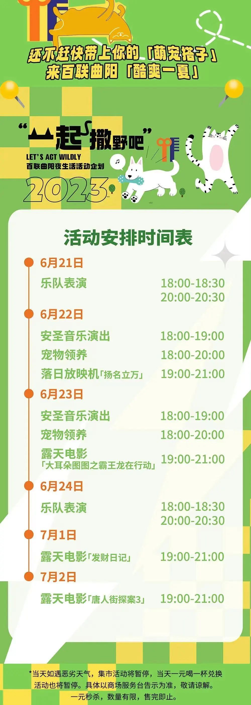 “夜生活”的精彩当然少不了动感音符和缤纷霓虹,乐队表演、少儿架子鼓演奏、露天电影将轮番上阵,捕捉节庆余韵。落日放映厅精彩不停,将带来扬名立万、大耳朵图图之霸王龙在行动、发财日记、唐人街探案3等知名影片,与观众分享艺术的魅力,点亮专属于夏日的浪漫之夜。