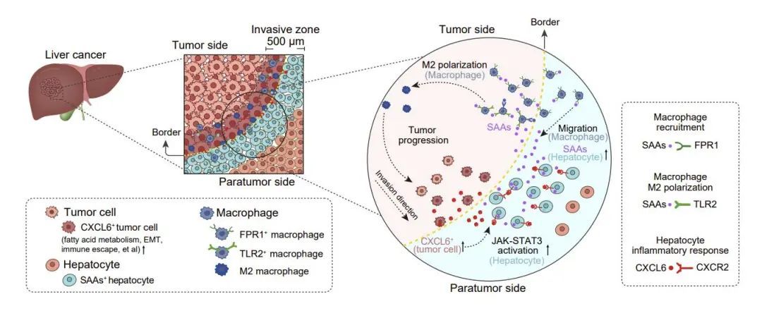 综上所述,该项研究主要基于超高精度的空间转录组技术结合单细胞测序、多色荧光等多组学手段,全面谱绘了原发性肝癌空间转录图谱,重点聚焦肿瘤交界区,首次发现横跨肿瘤和癌旁组织交界线上两侧各250µm的特殊带状区域(共500µm),突出表现为局部免疫抑制微环境、肿瘤细胞脂肪代谢增强和严重肝细胞损害状态,并将该区域定义为肿瘤侵犯前沿区(Invasive zone)。同时进一步精细解析发现侵袭前沿区中,肿瘤细胞可通过高表达CXCL6,通过激活肝细胞JAK-STAT3通路进而促进其SAAs高表达,可通过SAAs-FPR1和SAAs-TLR2分别募集和诱导巨噬细胞M2极化,形成局部免疫抑制微环境,进而促进肿瘤侵袭和转移。