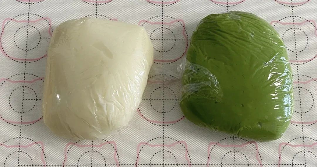 5、取一部分白色面团加入抹茶粉调成绿色;另取一小部分白色面团加入粉色色素调成粉色面团后备用。