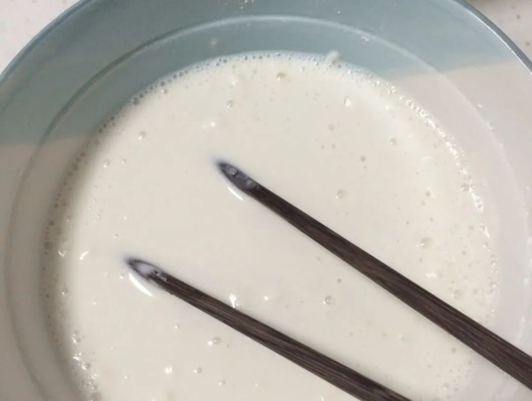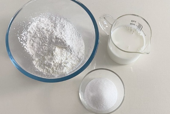 2、取糯米粉150克、玉米淀粉50克、糖100克、牛奶280克,一齐倒入容器中搅拌成均匀的面糊,过筛后备用。