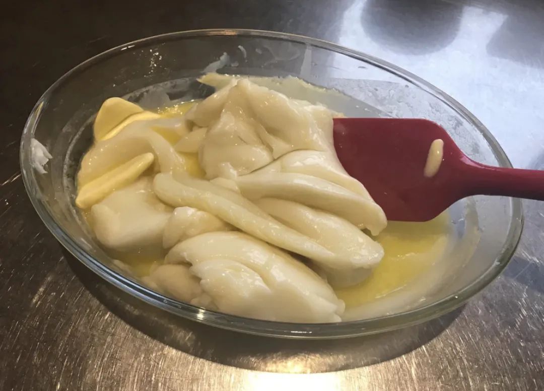 4、待面糊凝结成固态后从蒸锅中取出,在热面团里加入黄油慢慢揉匀,让黄油充分融入面团。