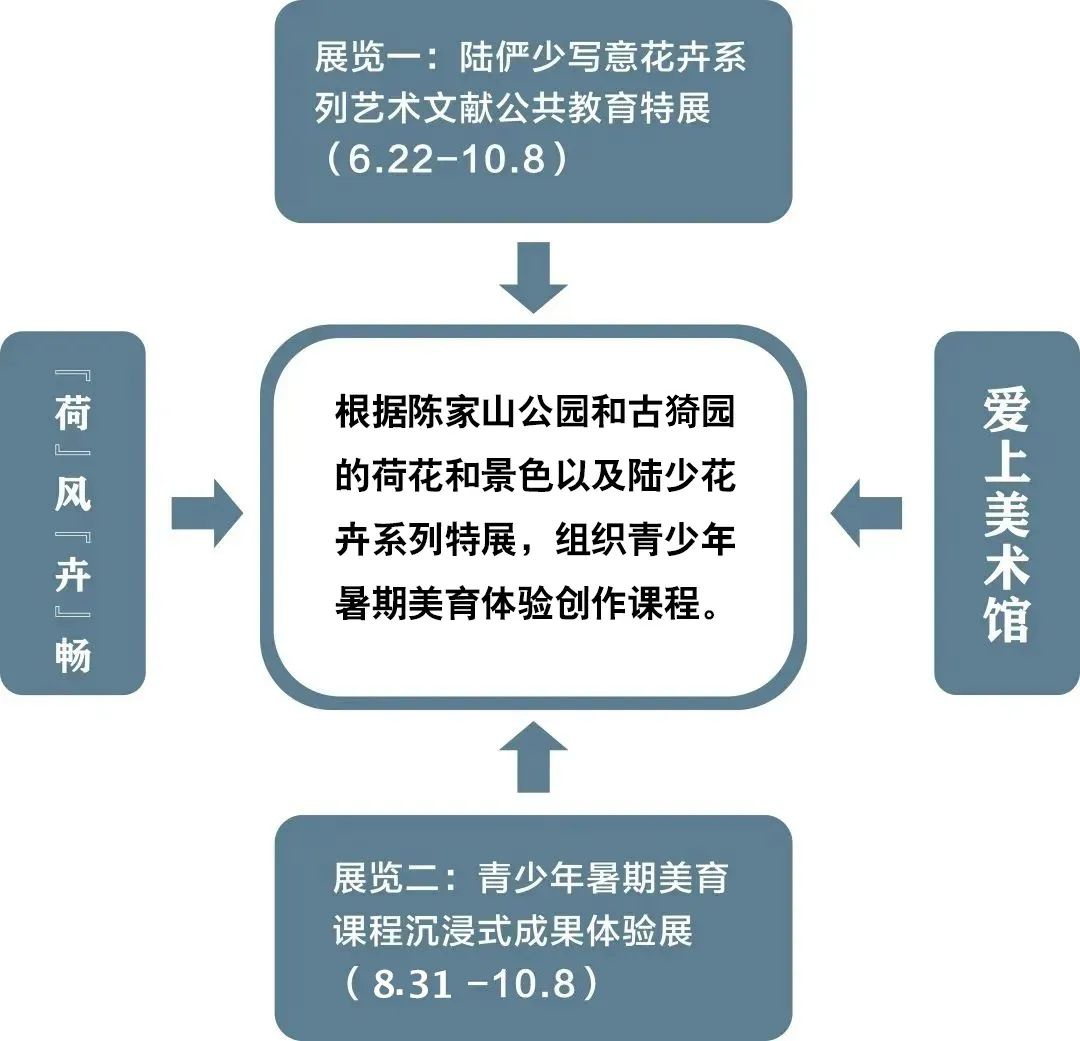 2023之夏,陆俨少艺术院把“文旅融合+”与“公园+”有机融合,以“活化典藏”引导“公共教育”,以“校外课程”孵化“社会大美育”,开展“陆俨少写意花卉系列艺术文献公共教育特展(6.22-10.8)”、“馆校结合青少年暑期美育体验创作课程(6.22-8.27)”、“青少年暑期美育课程成果沉浸式体验展(8.31-10.8)”等多项艺术活动。