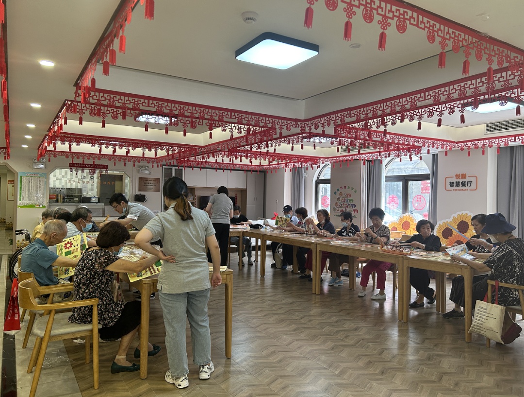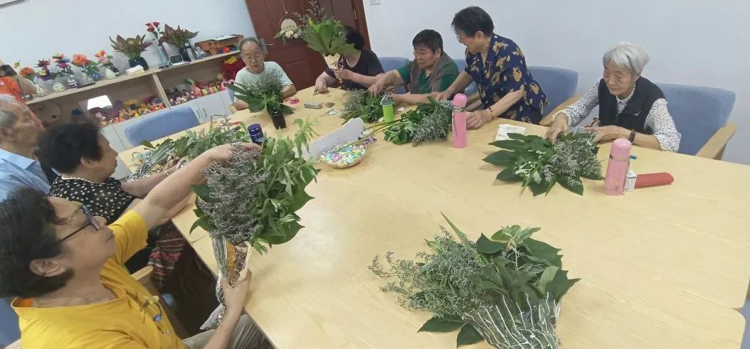 “艾草有长有短,要摆得高低不等,这样才会有错落层次感,制作的艾草花束更加美观。”上午10时,万宏养老集团旗下的紫云老年人日间照护中心里其乐融融。
