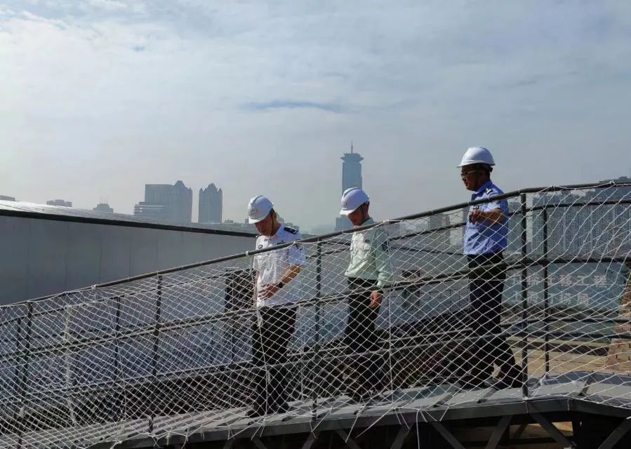 大家穿过距离地面近8米的悬梯,走向临时保护棚。安保部队长老张熟稔地与几人打着招呼,向刘昕炜展示全新加装在悬梯两侧以及保护棚周边的防护网。“刘所长叮嘱我们加装的这些防护网派上了大用场,施工的时候,大家都觉得安心很多。”
