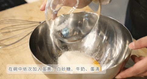 1. 在碗中依次加入蛋黄、白砂糖、牛奶和蛋清。