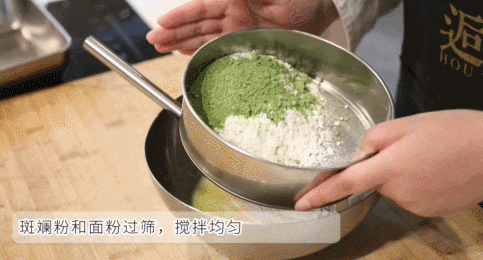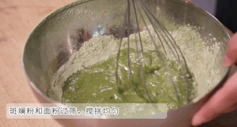 3. 搅拌均匀后,再将斑斓粉与面粉混合过筛,并搅拌均匀。
