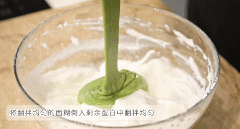 6.将翻拌完的面糊倒入剩余蛋白中,继续翻拌均匀。