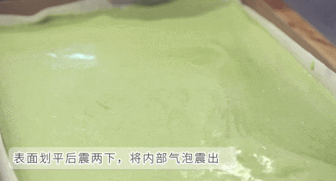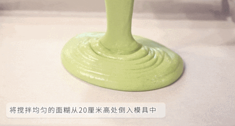 7.将翻拌均匀的面糊从20厘米高处倒入模具中,将表面划平后,在桌上震动几下,将内部气泡震出。