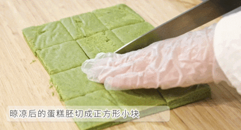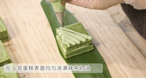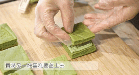 10.在将晾凉后的蛋糕胚切成小块,在蛋糕表面均匀涂抹上抹茶奶油,再覆盖上另一块蛋糕胚。