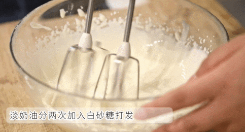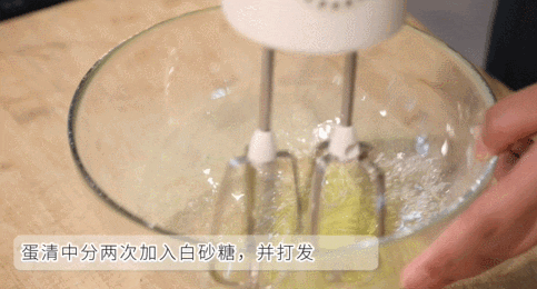 4. 另取一干净容器,加入蛋清分两次加入白砂糖并一起打发。