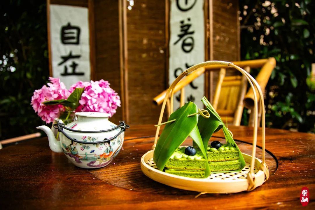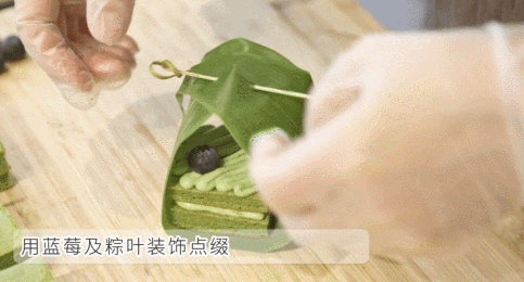 11.用抹茶奶油再均匀涂满蛋糕表面,用蓝莓和粽叶加以装饰即可。
