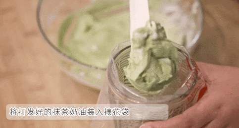 9.淡奶油中分两次加入白砂糖打发,再加入适量抹茶粉混合打发。将打发后的抹茶奶油装入裱花袋。