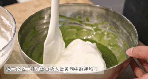 5. 取三分之一打好的蛋白加入斑斓糊中翻拌均匀。