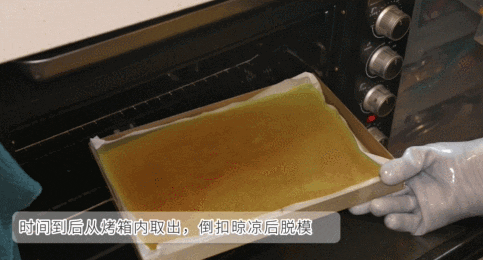 8.放入预热后的烤箱,上下火150℃,烤20分钟。烤完后将蛋糕胚从烤箱中取出,倒扣晾凉后脱模。