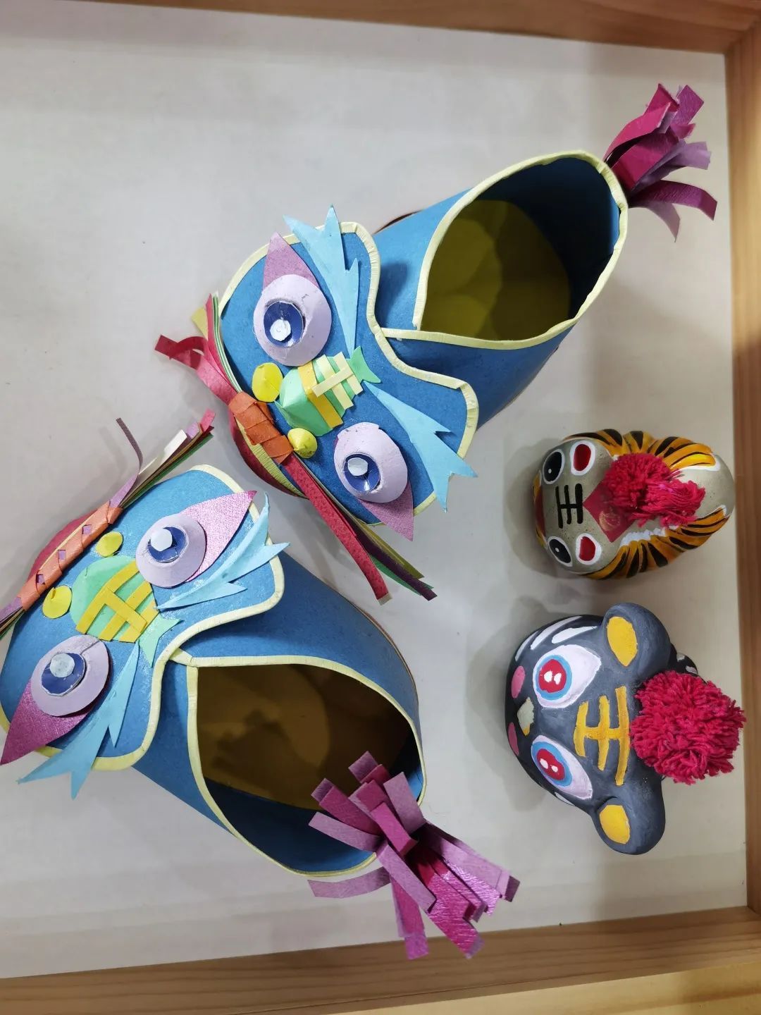 在学校的手工艺坊内,随处可见一双双憨态可掬、活灵活现的虎头鞋。几位学生正在老师的指导下,用彩泥、彩纸等素材制作形状各异的虎头鞋。据学校艺术教研组组长范红仙介绍,一双地道的虎头鞋必须是纯手工缝制,做工讲究又复杂,仅虎头上就需用刺绣、拨花、打籽等多种针法,鞋面的颜色以红、黄为主,虎嘴、眉毛、鼻、眼等处常采用粗线条勾勒,夸张地表现虎的威猛。长辈们亲手制作虎头鞋,在一针一线中寄托着对孩子的祝福,祈愿孩子健康成长,可以像老虎一样威猛强壮。