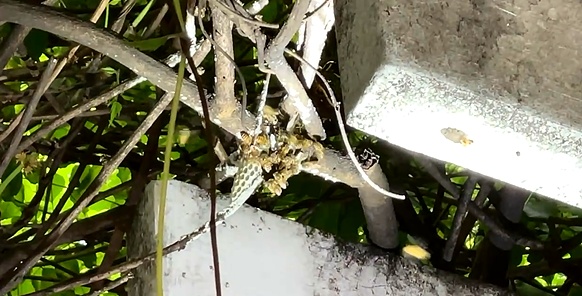 据了解,6月19日晚间,中福城一期的物业工作人员在日常巡视中,突然发现花园里的长廊架子上突然“长出”了一个丝瓜般大小的蜂巢。“这是马蜂还是蜜蜂呀?”长廊作为居民们日常休憩的场所,再加上傍晚光线不足和大雨影响,物业工作人员看不清到底是马蜂还是蜜蜂,只好先把蜂巢出现的区域隔离起来,避免不知道情况的居民进入,然后将这一情况告知了南京东路街道小花园居民区党总支书记徐娟。