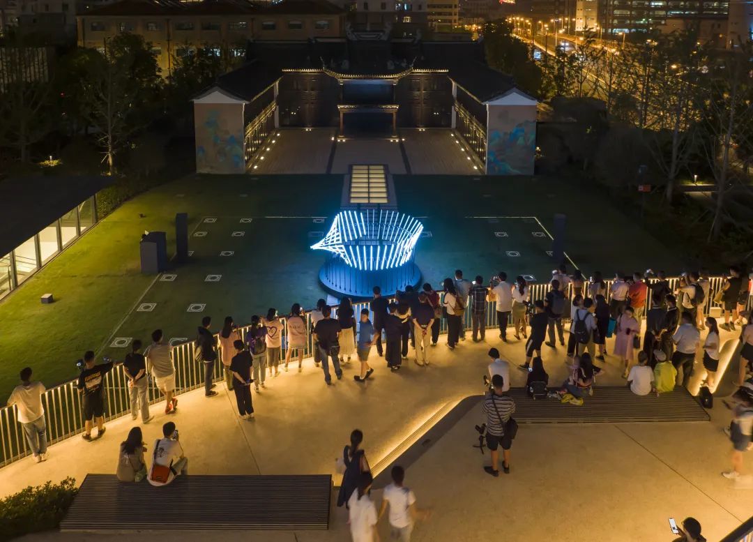 汲取天后宫的百年文化积淀,暗含天圆地方的中华哲理,机械动态、音效及炫光与诗相和,呈现出一个有机的“生命体”,在诗意的涟漪及奔涌的狂澜间不断变化,表达出上海苏河湾天地万象的无边界体验感。