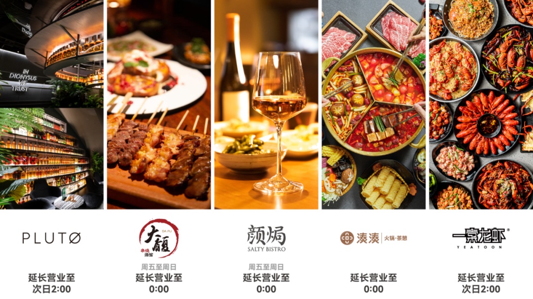 上海苏河湾万象天地多家餐厅酒吧将延长营业时间至夜间,并推出夜宵美酒套餐或指定酒水买一送一活动。