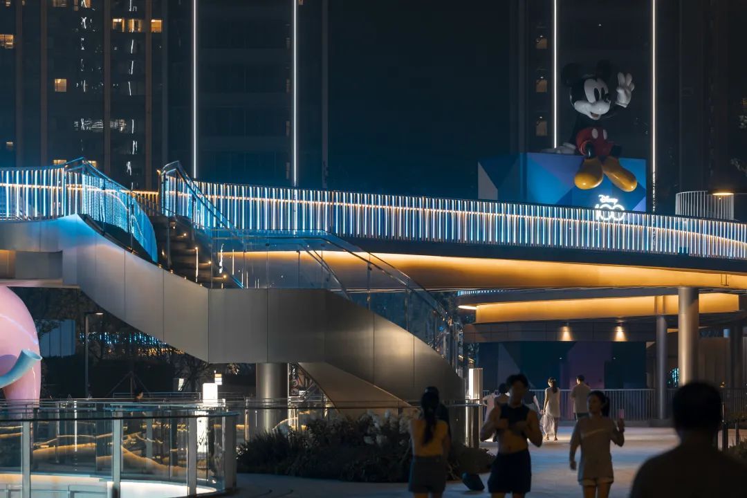 链接东里及西里的天桥带来由中国新锐视觉艺术团队persec创作的灯光变幻作品,其利用光点堆叠与行进的设计,表现出水滴涟漪与奔涌狂浪的变化,用独特的视觉感官体验照亮水岸白夜。