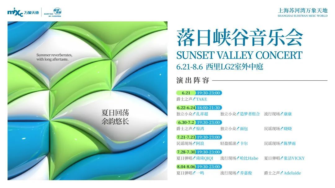 夏日水岸夜生活节期间,上海苏河湾万象天地集结众多音乐人,将于即日起至24日18:00—21:30、6月30日至8月6日周五及周末19:30—23:00,在西里LG2层中庭上演“落日峡谷音乐会”,打造涵盖民谣、摇滚、爵士、流行等16场不重样的音乐表演,以夏日弹唱、独立小众、流行现场等不同音乐主题点燃夏日夜生活。