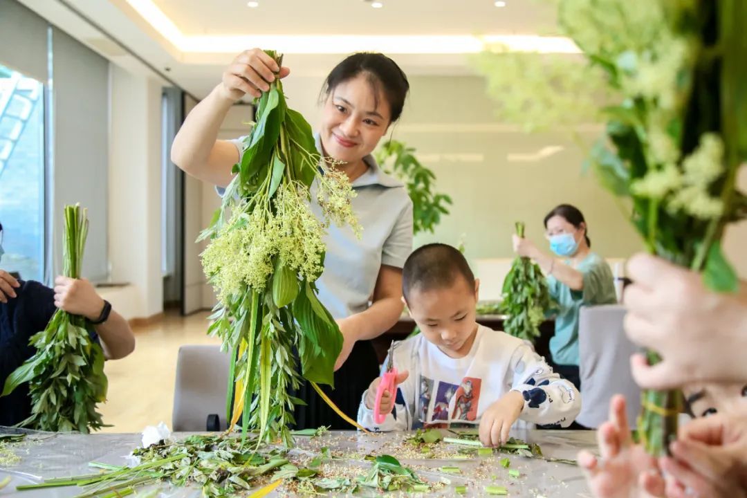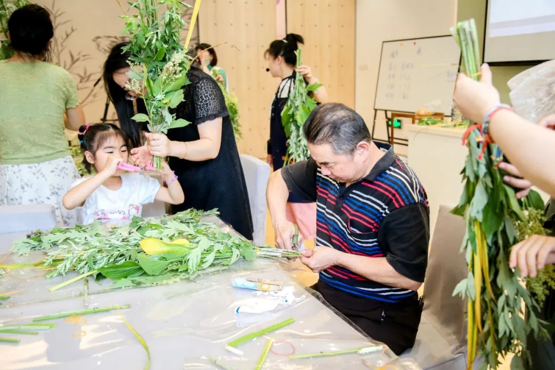 “菖蒲是一种古老的中药,能够净化空气,驱避瘟疫,具有消炎和祛风利湿的功效,由于叶子的形状像一把利剑,也寄托了人们‘斩千邪’的美好寓意。”活动现场,艾草、菖蒲、玉簪、香樟等插花材料飘来淡淡清香,沁人心脾。插花老师一边展示,一边向大家讲解每种植物的功效和寓意。