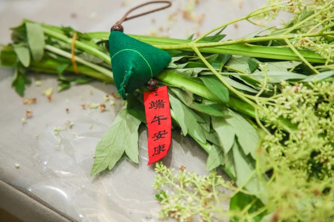 修剪、整形、插花,再挂上装饰香囊和“诸邪退散”“端午安康”“一举高粽”的祝福卡片,原本不起眼的中草药材摇身变成了精美花束。“我选择了两张卡片,一张祝福大家端午安康,另一张‘一举高粽’,希望自己在学校里可以取得好成绩。”学生李维倩说。