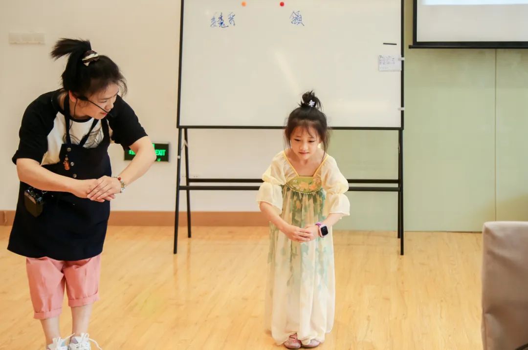 “右手压左手抱拳,躬身屈膝道万福,这就是明朝的万福礼。”活动开始前,指导老师徐敏婕还向大家讲解端午节由来和历朝历代的传统礼仪。颌首礼、肃拜礼、交叉礼、叉手礼,孩子们身着汉服有样学样,颇具风范。