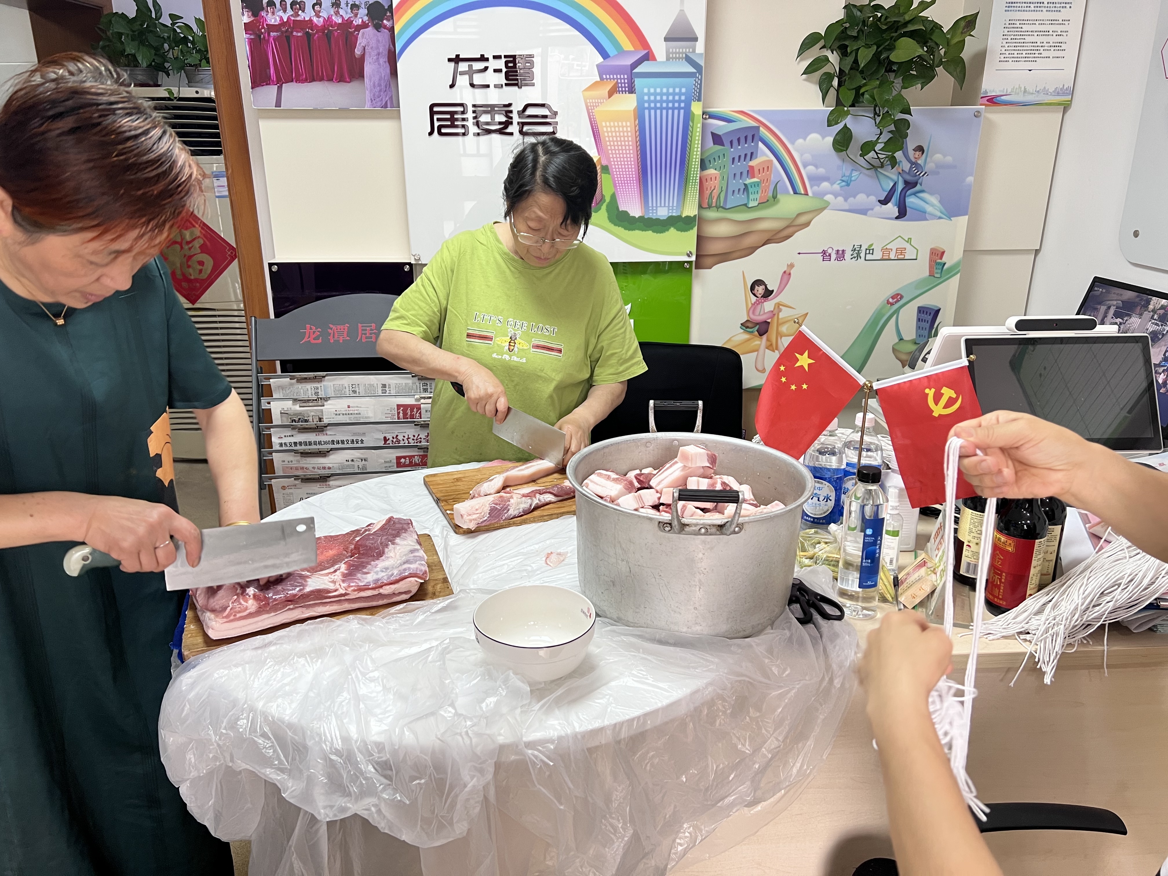 由于帮扶对象较多,要送上门的粽子数量较大,龙潭居委会早早准备好了猪肉、糯米、粽叶、调料等食材。从切肉腌肉、淘米洗叶到包粽煮粽、送粽上门,心灵手巧的龙潭居民将居委小院化作烟火厨房,在院子里围坐一圈,有说有笑地拌馅料、包粽子,现场充满了热烈祥和的氛围。