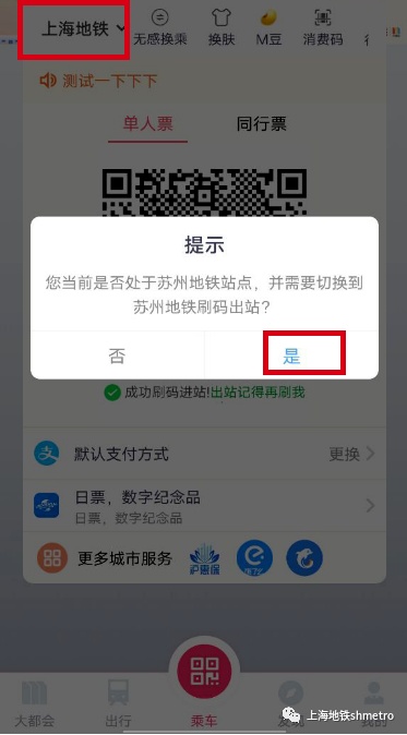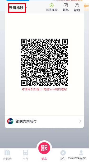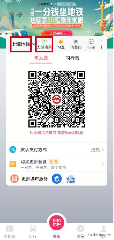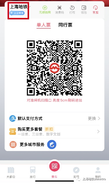 1、成功开通无感换乘后,若出发地为上海,则扫上海地铁乘车码进站。