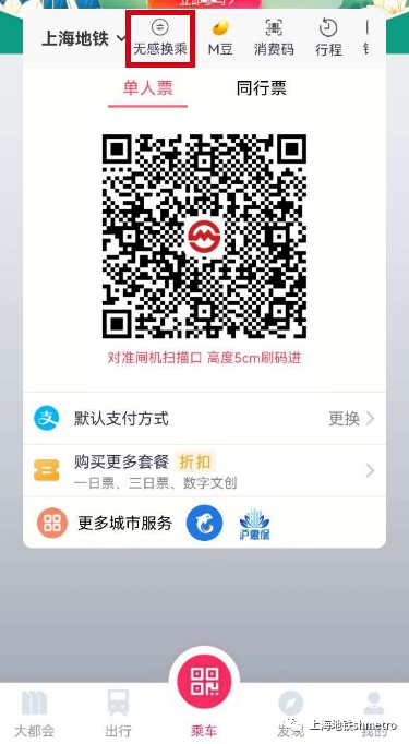 4、开通成功后上海苏州的乘车码上方会显示【无感换乘】操作按钮。