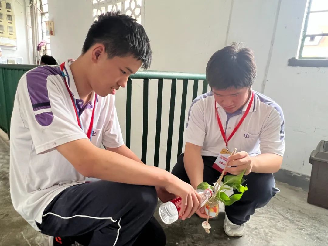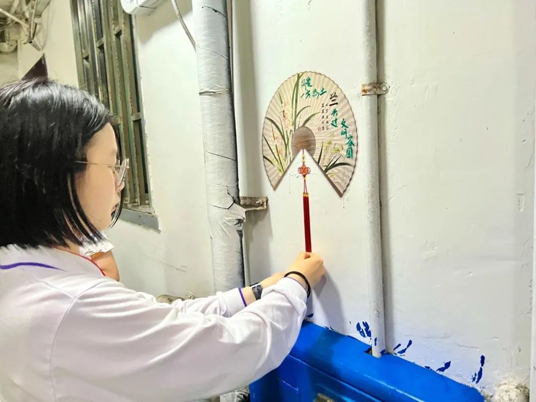 当天,一群身着统一校服、笑容满面的上理附中高中生带着颜料刷、水培植物、扇面,以及事先准备好的装裱画作来到延吉三村20号楼和21号楼,热火朝天地忙碌起来。