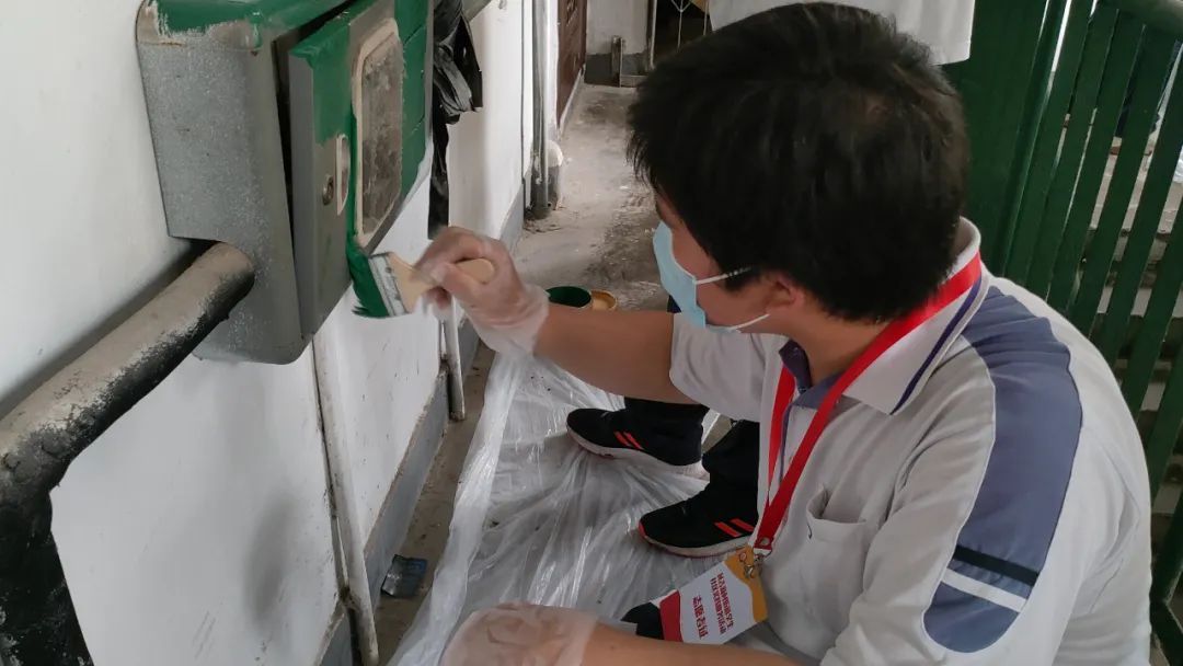 “侬好,那么多学生在楼道做啥?”“阿姨,我们是上海理工大学附属中学的高中生,我们在给楼道美化,您看美化后的楼道看着心情是不是都变好啦。”学生们忙碌之余与社区居民互动聊天,和乐融融的氛围中展现着互帮互助的文明精神。