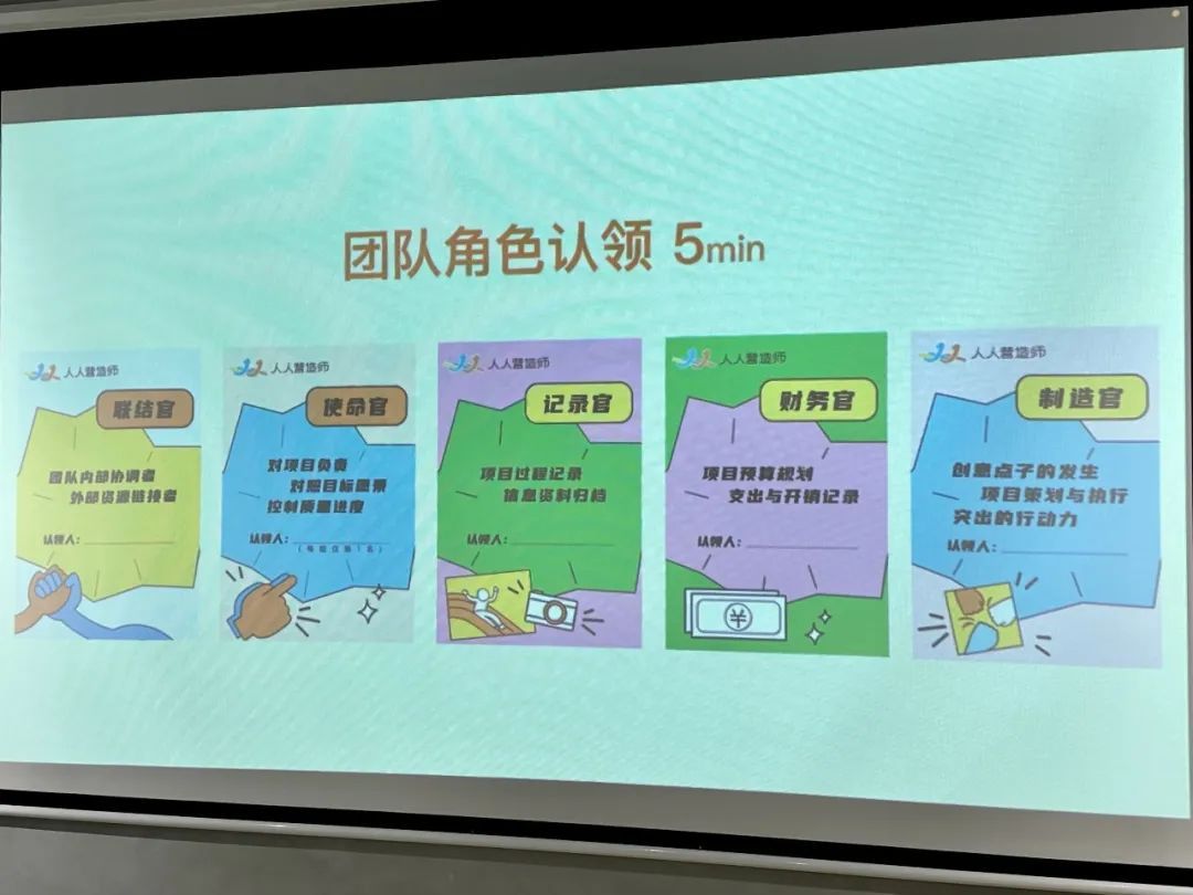 介绍完微项目后,开启了“头脑风暴”环节,参加活动的人人营造师、社区工作者、社区志愿者们根据项目的不同,分别围坐在一起,在项目清单上记录大家的交流成果。随后,大家还根据各自分工,认领了“联结官”“使命官”“记录官”“财务官”“制造官”等不同的团队角色。