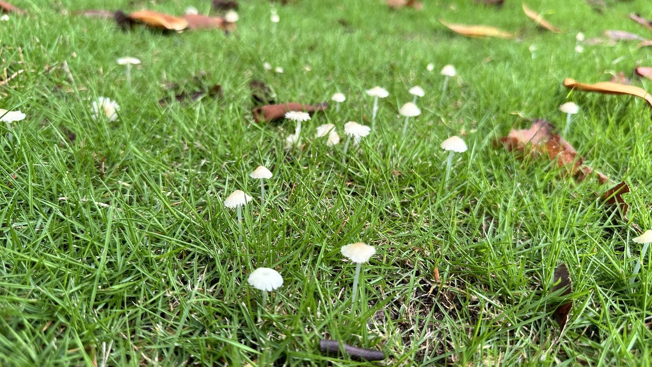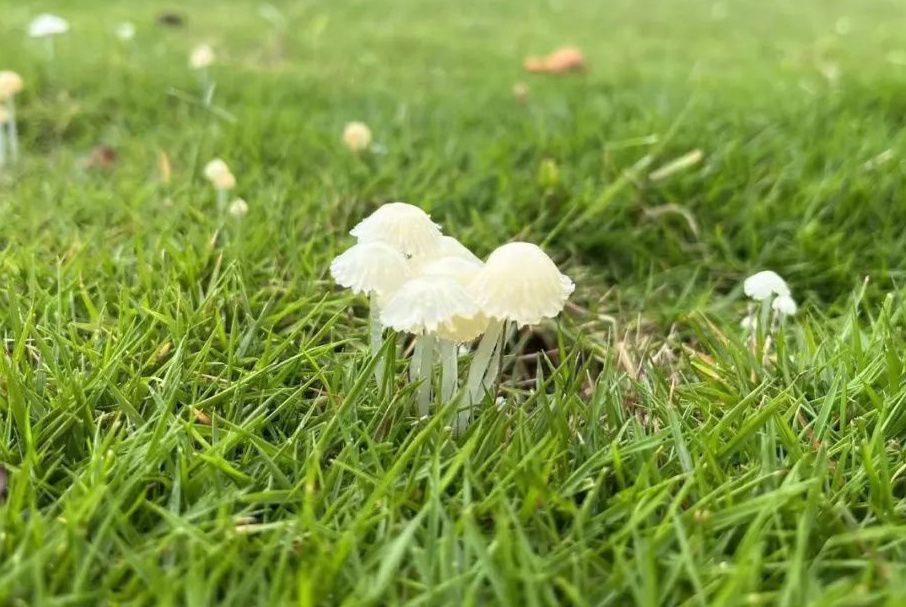 近期,上海正值梅雨季。连续几日的阴雨过后,家住南翔镇东社区的陈女士发现,金地格林世界小区的草地上冒出成片蘑菇,如同白色繁星,造型别致。