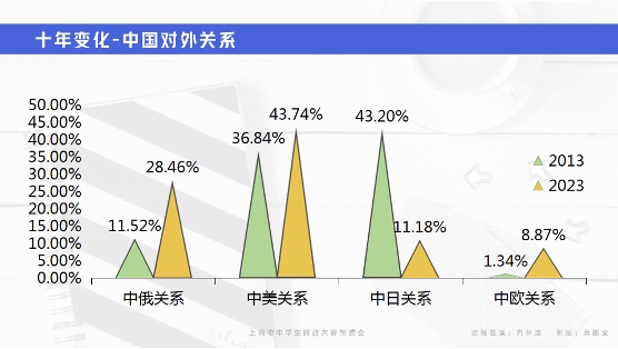 2013年发布的“上海中学生时事关注微调查报告”显示:43.20%学生最关注“中日关系”,其次才是中美关系(35.84%)、中俄关系(11.52%)。时隔十年,中美关系(43.74%)成为上海中学生最关心的对外关系。