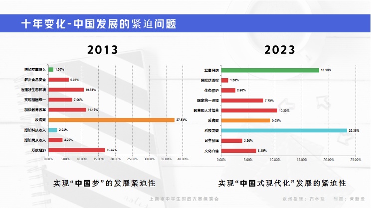 2013年发布的“上海中学生时事关注微调查报告”显示:在回答“要实现‘中国梦’,我们的当务之急是什么?”这一问题时,反腐败(37.54%)高居榜首。时隔十年后,在回答“你认为,要如期实现中国式现代化,最需要在什么领域加大投入、加快发展?”上海中学生认为“科技突破”是实现“中国式现代化”的核心要务。