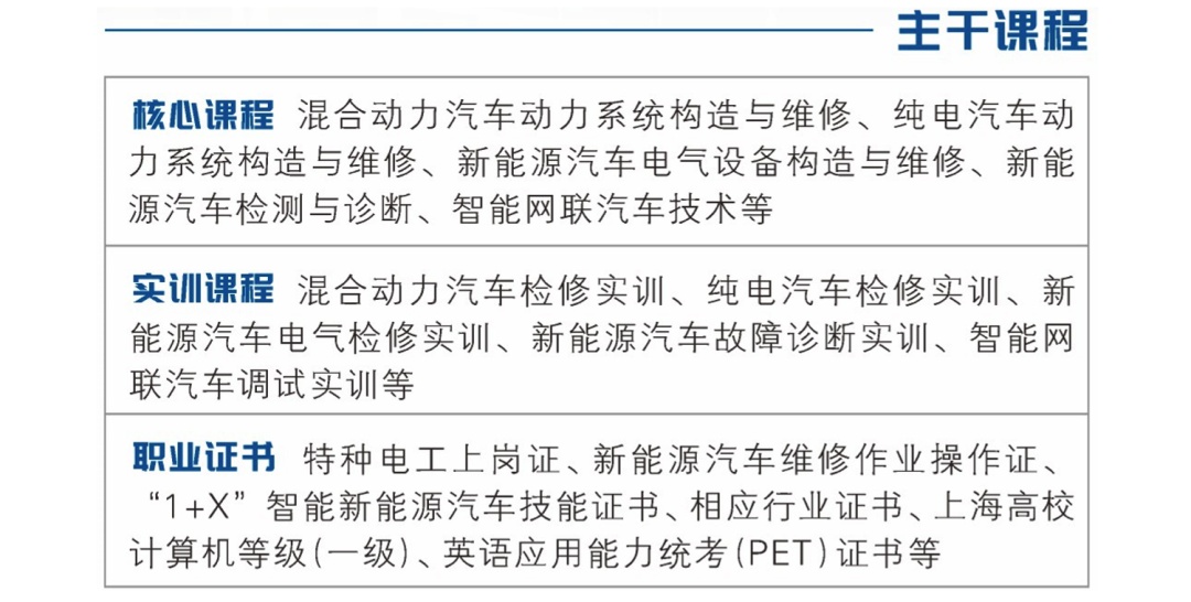 本专业主要培养掌握纯电动汽车、混合动力汽车技术及汽车智能控制技术,能胜任新能源汽车装配测试、检验检测、技术服务及质量管理等工作的高素质技术技能人才。