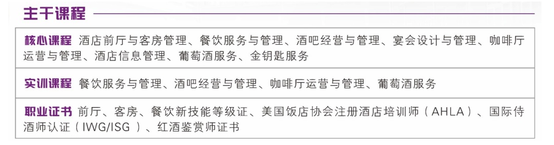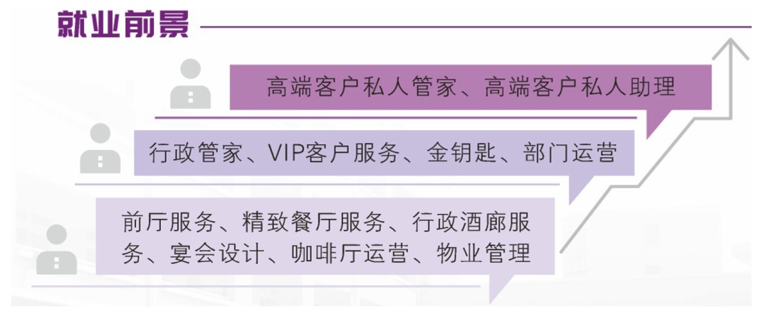 与企业共建东湖酒店产业学院,校企共同培养面向高星级酒店、文化主题酒店、精品酒店、国际豪华邮轮、国内游轮游艇等旅游接待业,从事酒店VIP接待服务、高端客户私人订制管家服务等高级岗位工作的高素质技术技能人才。