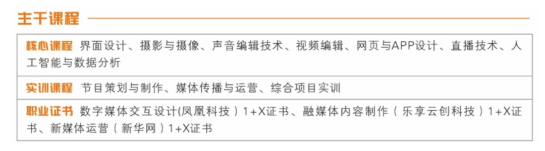 本专业主要培养从事界面设计、广告设计、融媒体内容制作、交互内容开发、直播软硬件设备搭建与调试、内容分发和运营等工作的高素质技术技能人才。