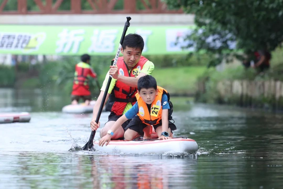 最终的桨板比赛将氛围推向高潮,经历了户外跑、骑行后,选手们虽满头大汗,却没停下脚步,在200米往返的河道上划动桨板奋力前行。