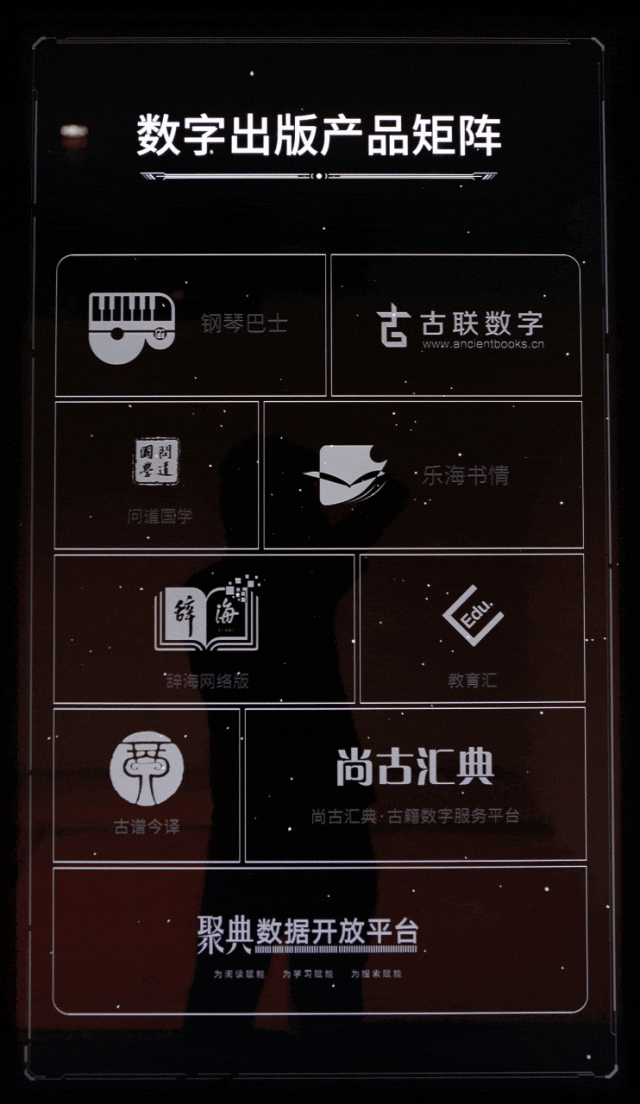 自2019年起先行实施的“数字出版精品遴选推荐计划”,作为“出版融合发展工程”的首个计划,申报项目多达1500余个,遴选出181个数字出版精品项目,优质平台11家。展厅设有互动屏集中展示这些平台,为观众的学习、研究和生活中的信息获取引介新的渠道。其中有:中华书局的古籍数字化平台“籍合网”,以古籍整理和数字化工作为基础线索,串联OCR文字识别、图文校对、自动标点、繁简转换等智能工具;上海辞书出版社开发的聚典数据开放平台,已成功在掌阅、微信阅读等在线阅读,上观新闻、新民等新闻资讯,“学习强国”、中国搜索等产品中累计调用次数超过6.8亿次。