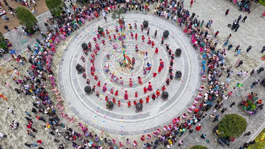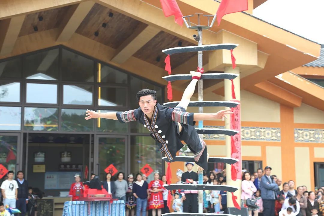 花山节活动在祭祖庆典仪式中正式拉开序幕。随后,歌舞《蝴蝶妈妈》《山茶绽放》《水韵江南》以及杂技表演《上刀山》等精彩文艺节目轮番上演,引得游客们阵阵欢呼和热烈鼓掌,不少游客与苗家群众围成圆形载歌载舞,热闹非凡。